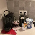 En plus d'une cafetière/théière, cet établissement est équipé d'une cuisine complète qui comprend un réfrigérateur et de la verrerie.